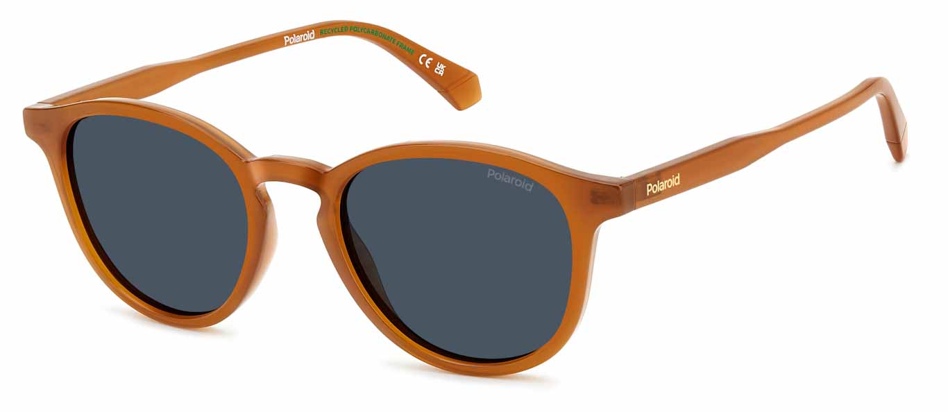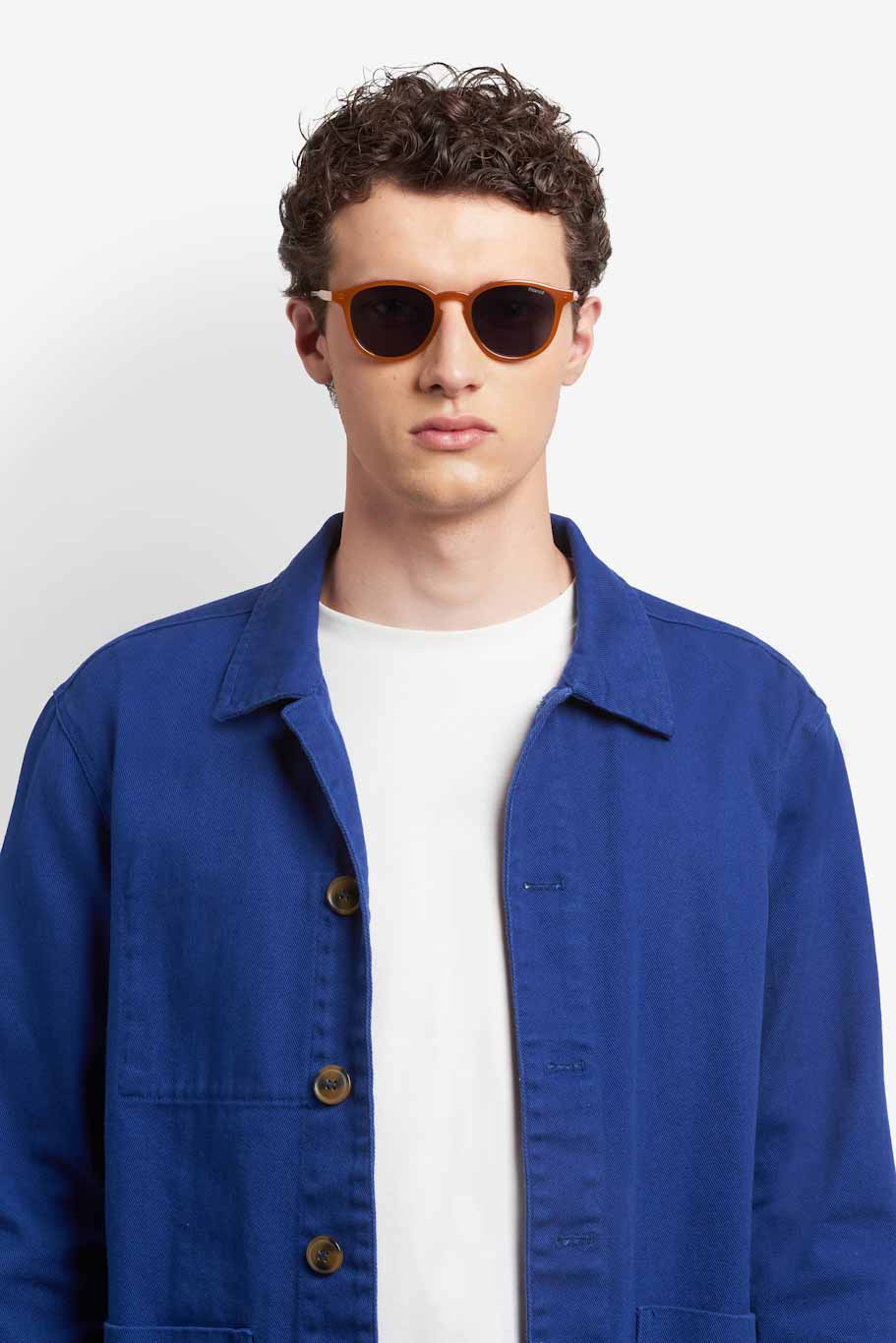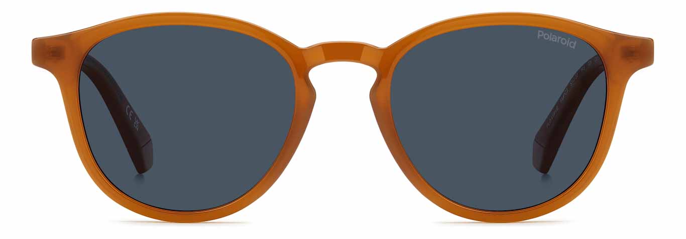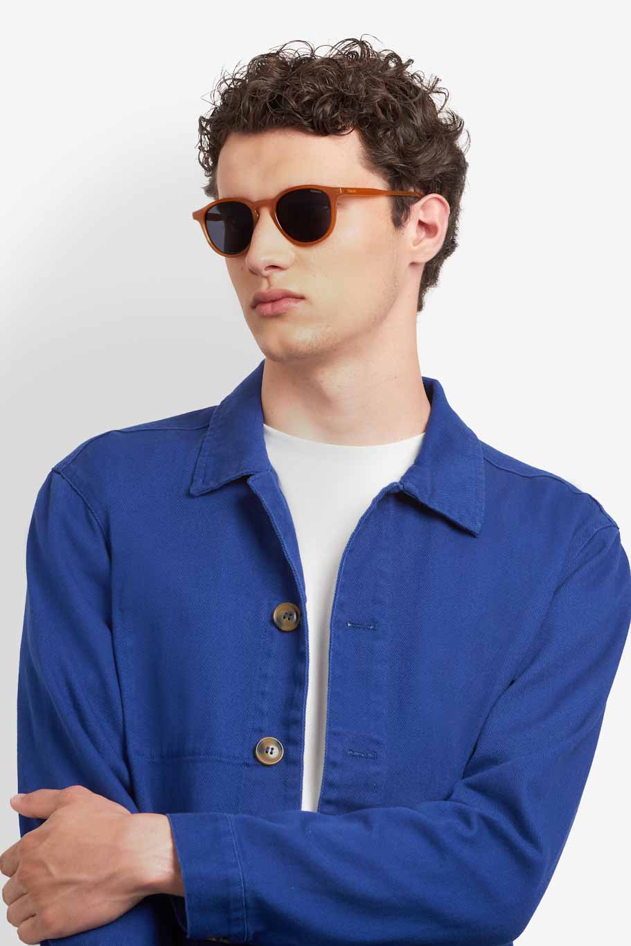 Πλαστικός tr90 αντρικός σκούρος πορτοκαλί οικολογικός, γυαλιστερός και ελαφρύς σκελετός σε σχήμα στρογγυλό και ρετρό στιλ με σκούρους μπλε πολωτικούς φακούς.