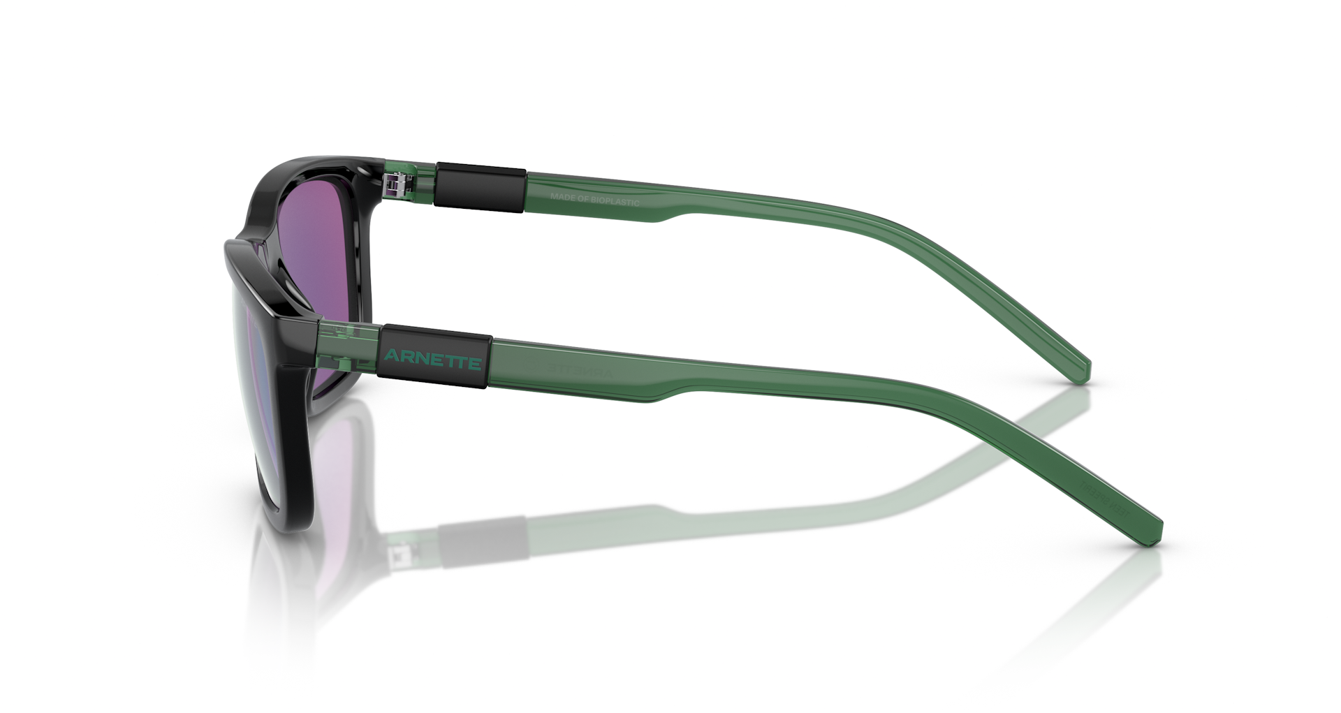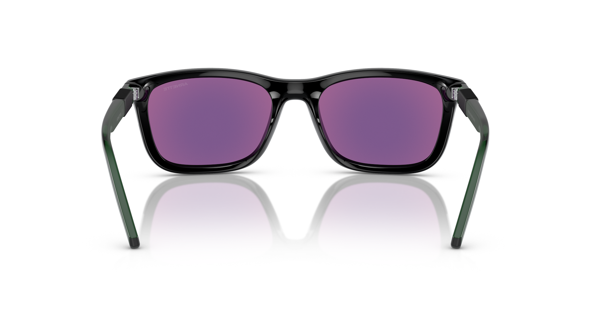 Πλαστικός tr90 εφηβικός μαύρος οικολογικός, γυαλιστερός και ελαφρύς σκελετός σε σχήμα μακρόστενο και αθλητικό στιλ με σκούρους μωβ UV400 και έντονο πράσινο καθρέπτη φακούς.
