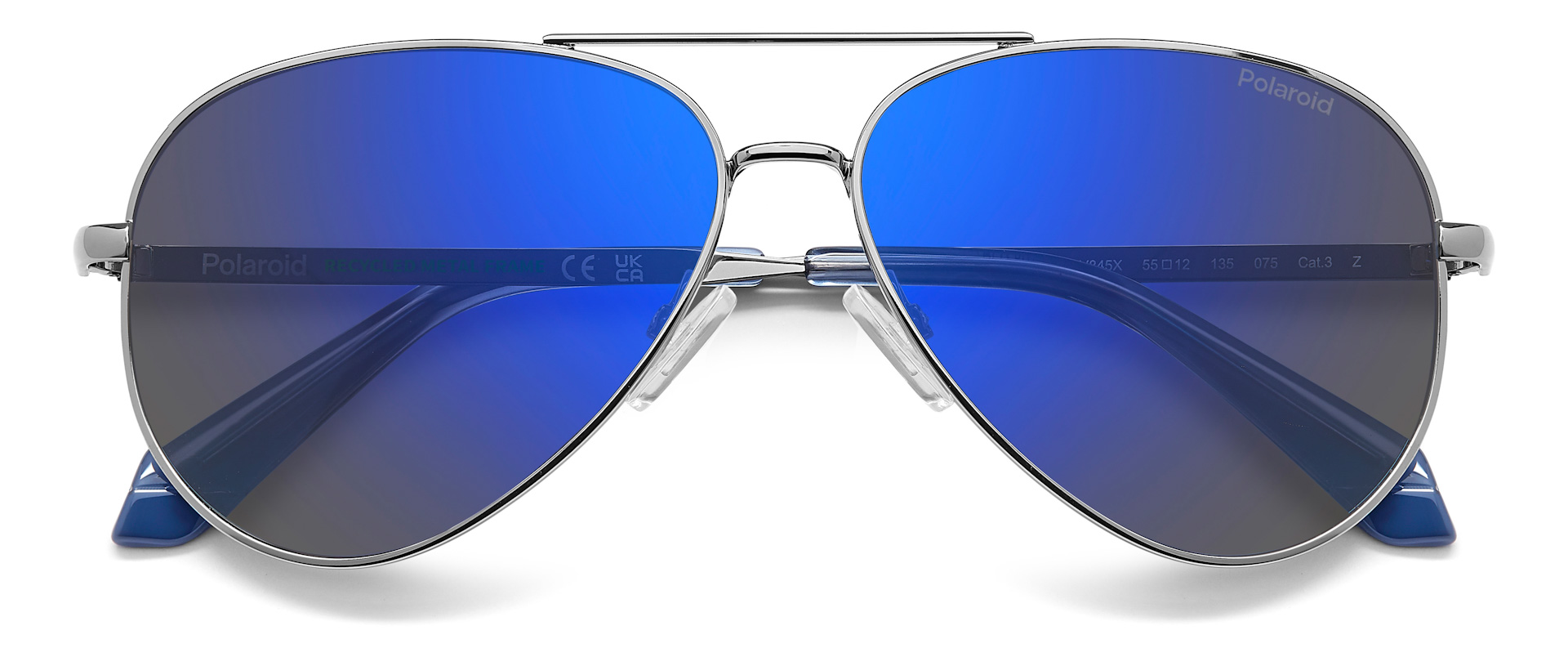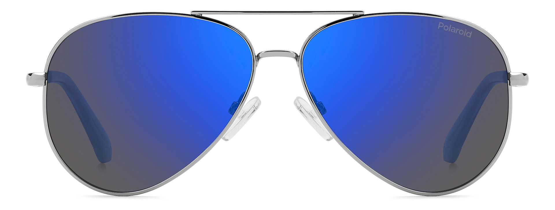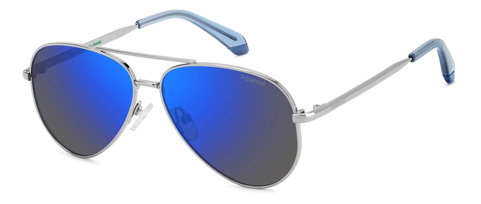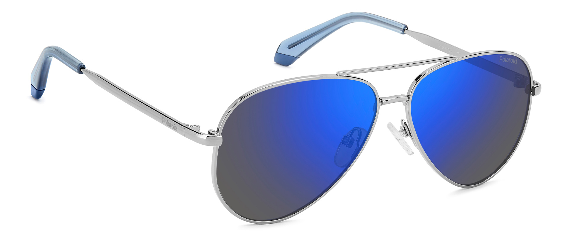Μεταλλικός παιδικός ασημί γυαλιστερός και ελαφρύς σκελετός σε aviator σχήμα και κλασικό στιλ με σκούρους γκρι πολωτικούς και μπλε καθρέπτη φακούς.