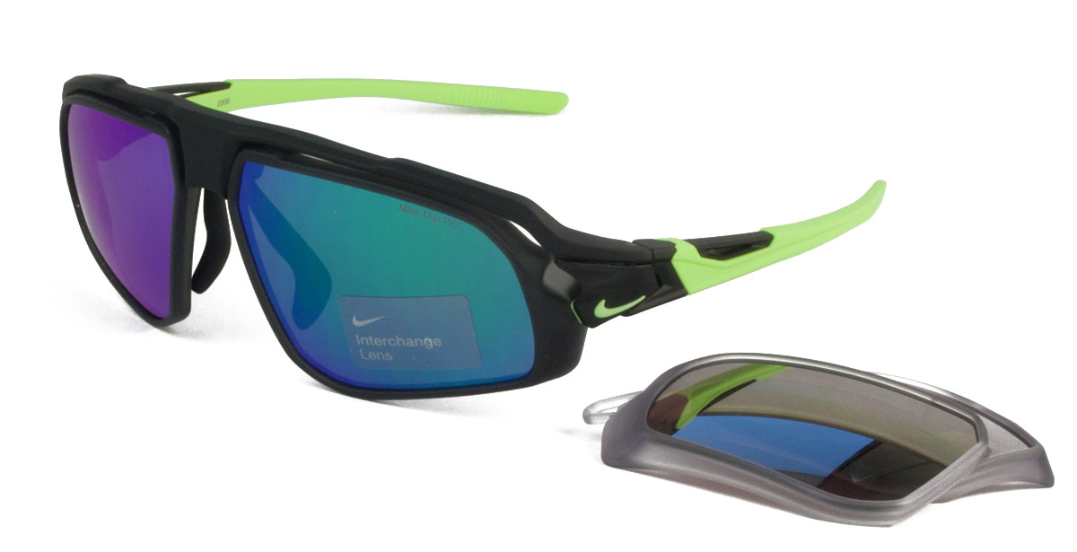 Κοκάλινος αντρικός ματ μαύρος ελαφρύς σκελετός με επιπρόσθετους φακούς σε σχήμα μακρόστενο και αθλητικό στιλ με σκούρος γκρι UV400 τεχνολογίας Nike Max Pro και μπλε-πράσινο καθρέπτη φακούς.