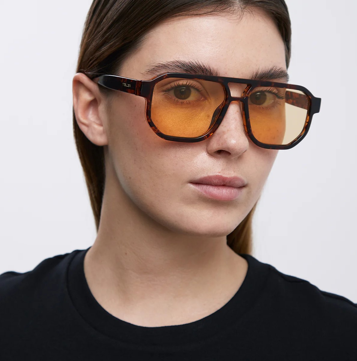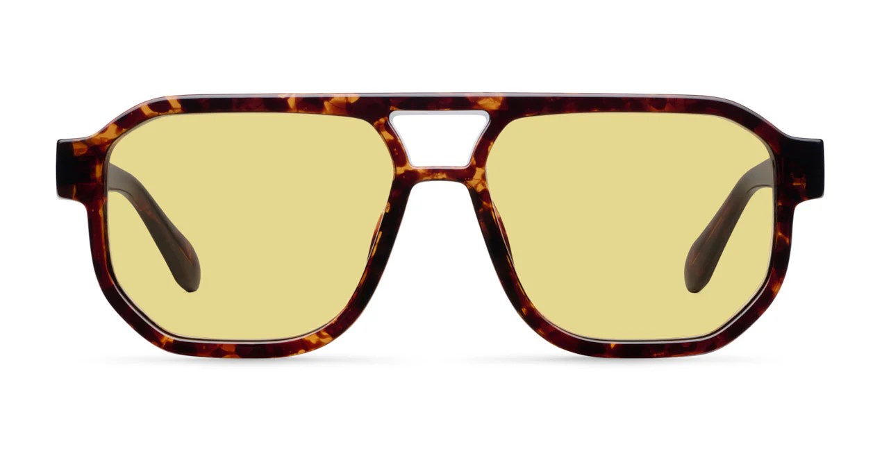 Κοκάλινος unisex καφέ ταρταρούγα γυαλιστερός και ελαφρύς σκελετός σε πολυγωνικό σχήμα και μοντέρνο στιλ με κίτρινους UV400 ανοιχτόχρωμους φακούς.