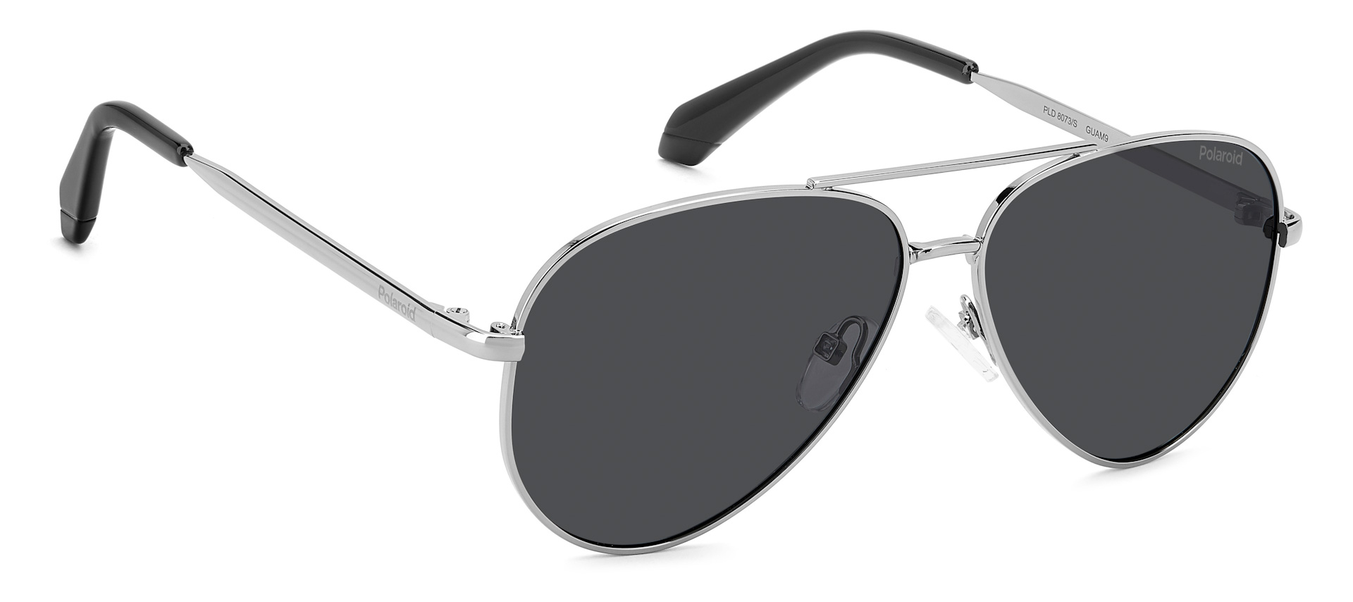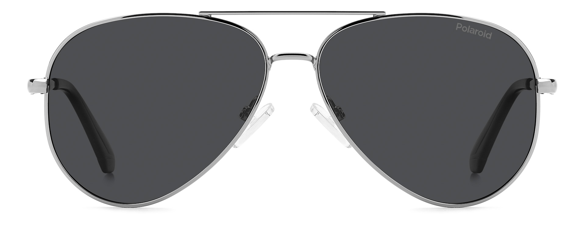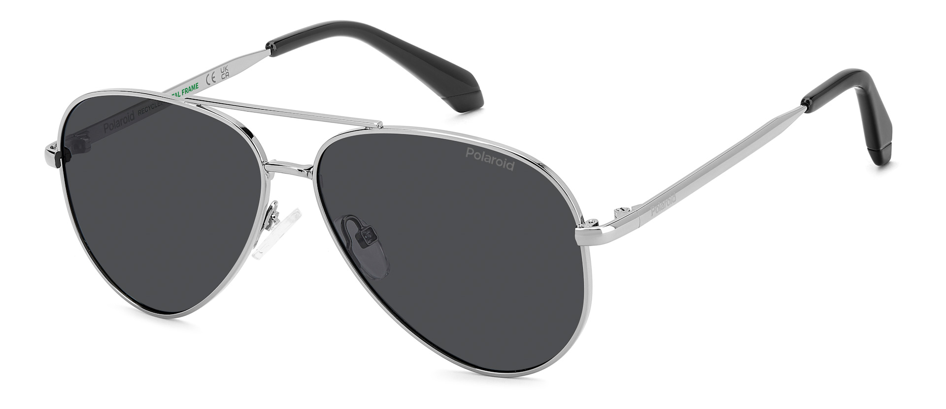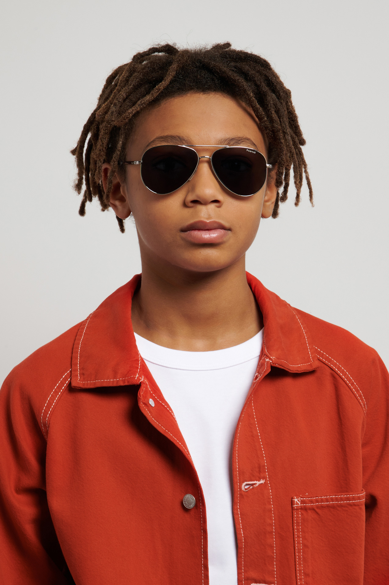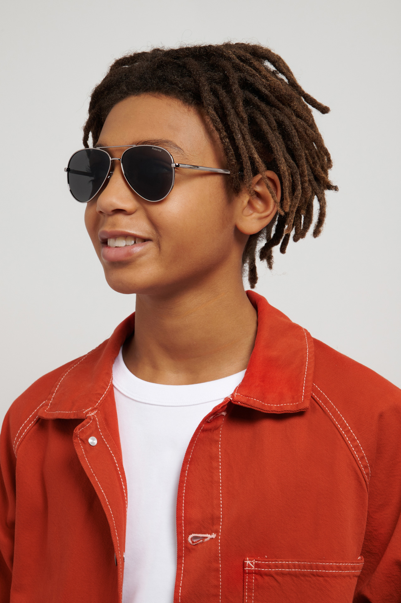 Μεταλλικός παιδικός ασημί γυαλιστερός και ελαφρύς σκελετός σε aviator σχήμα και κλασικό στιλ με σκούρους γκρι πολωτικούς φακούς.
