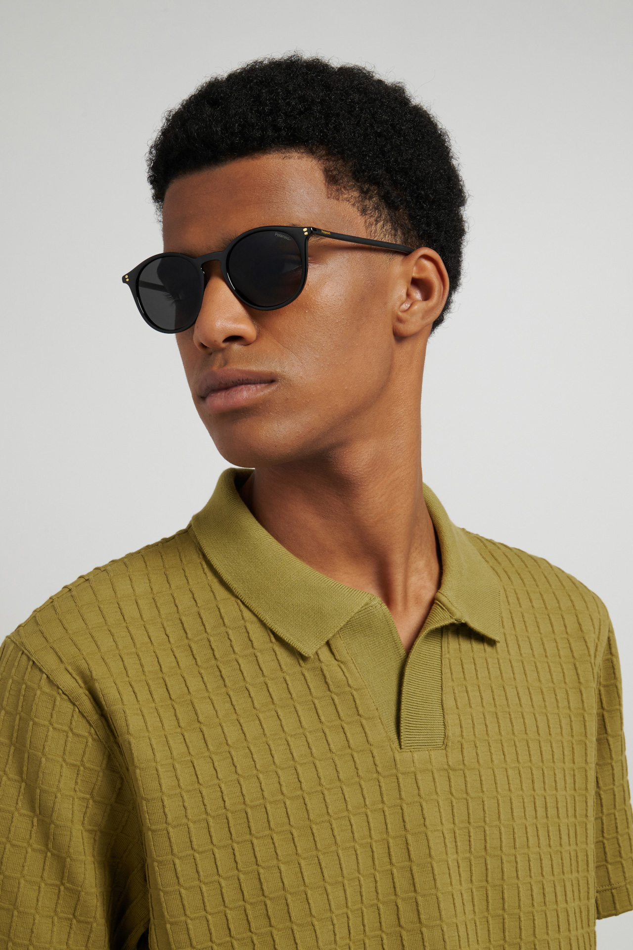 Πλαστικός tr90 unisex μαύρος οικολογικός, γυαλιστερός και ελαφρύς σκελετός με εύκαμπτους βραχίονες από καούτσουκ σε σχήμα στρογγυλό και ρετρό στιλ με σκούρους γκρι πολωτικούς φακούς.