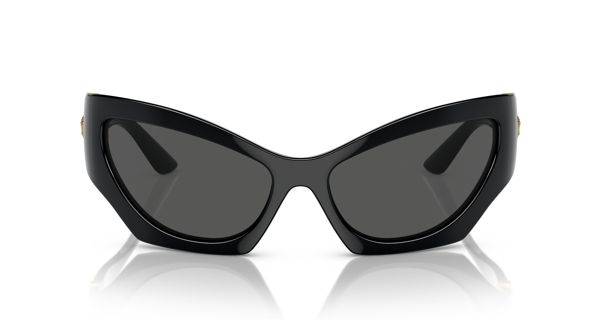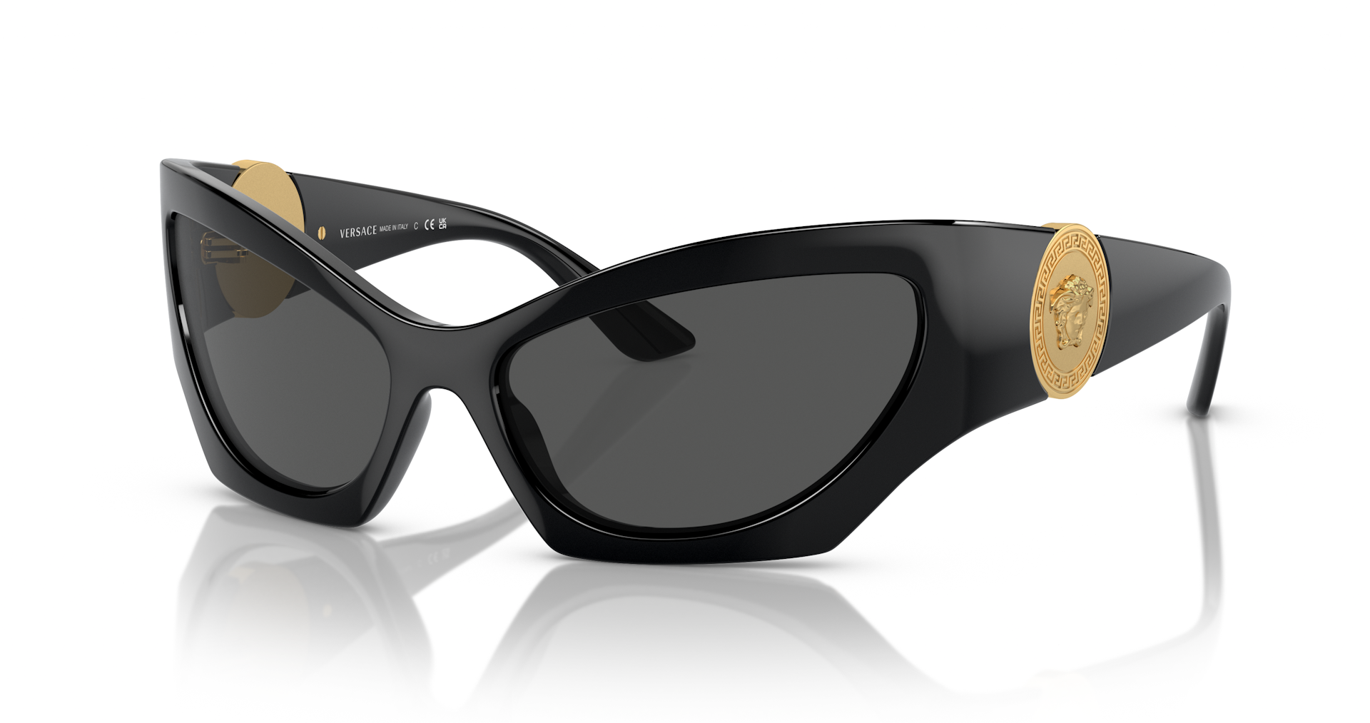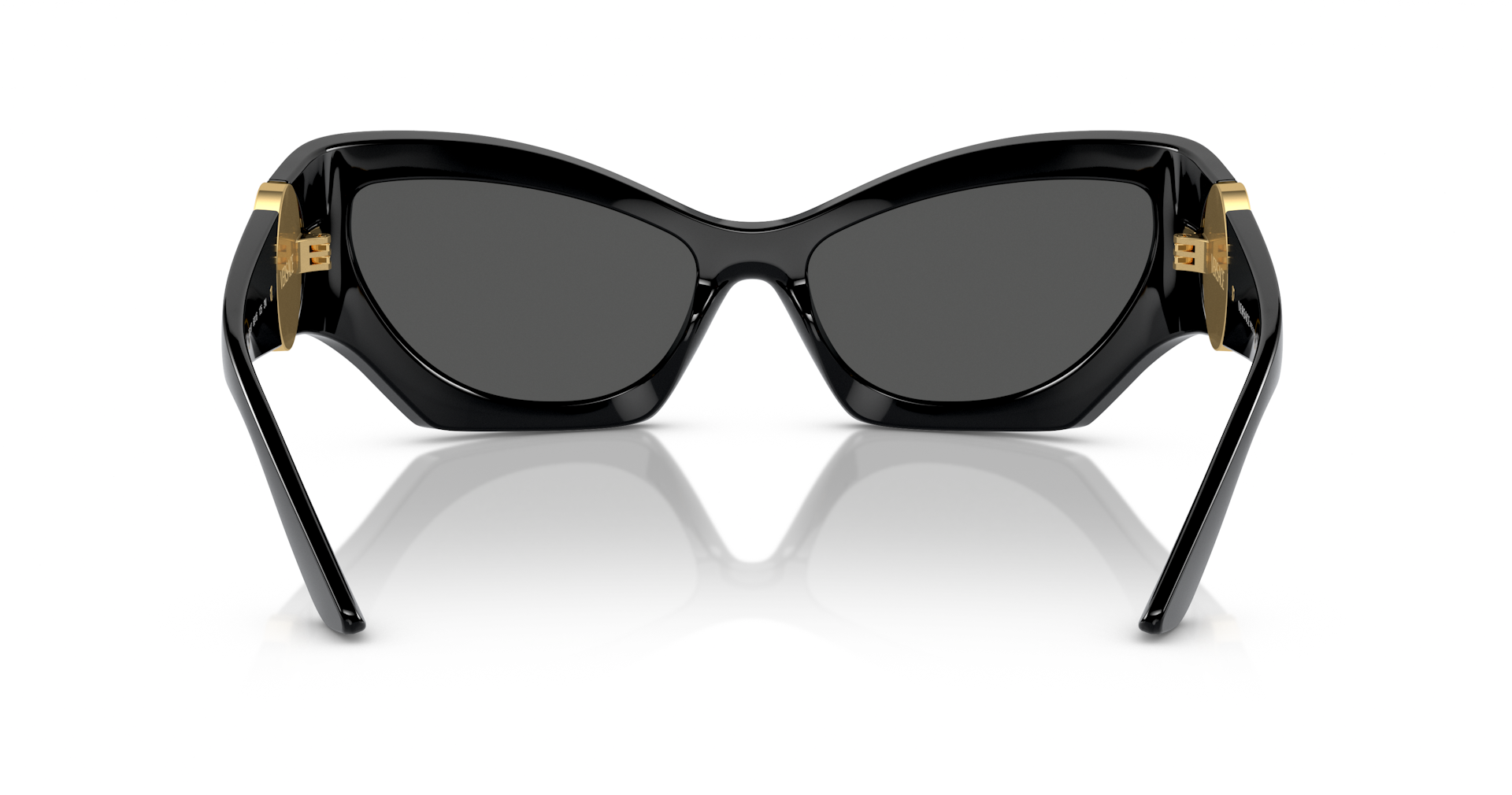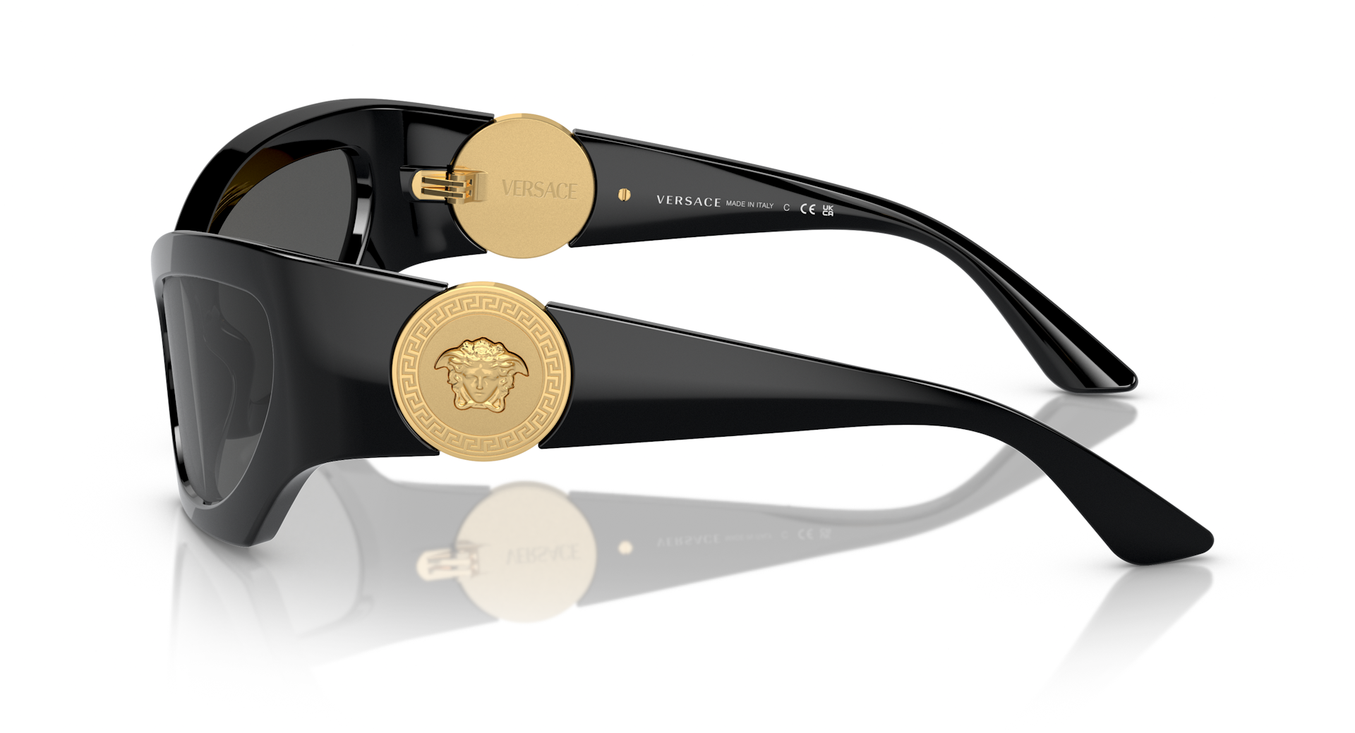 Κοκάλινος γυναικείος μαύρος γυαλιστερός σκελετός με χρυσό λογότυπο στους βραχίονες σε σχήμα έντονο οβάλ και φουτουριστικό στιλ με σκούρους γκρι UV400 φακούς.