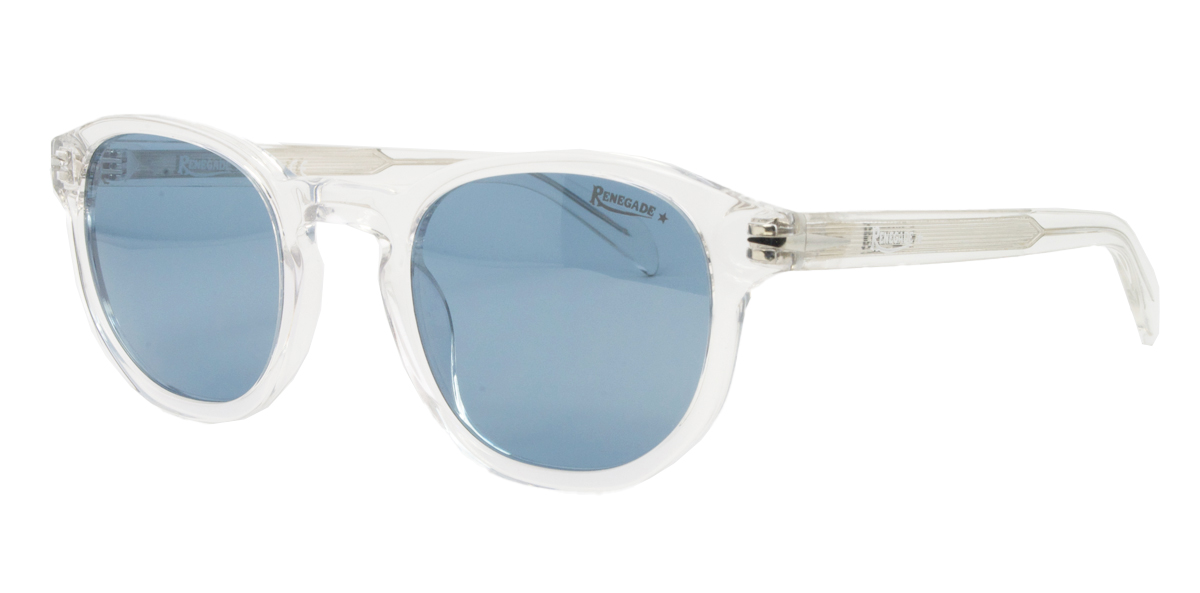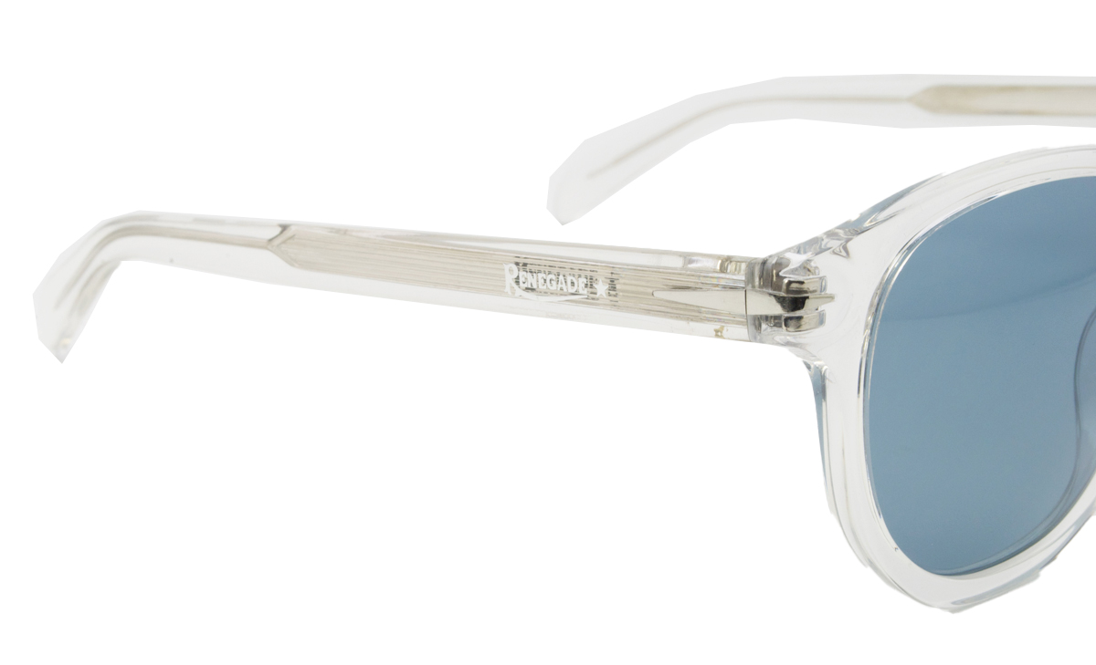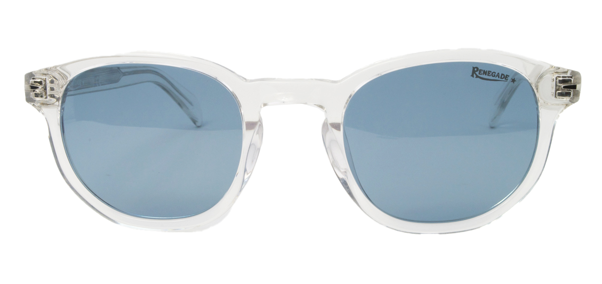 Κοκάλινος unisex διάφανος, γυαλιστερός και ελαφρύς σκελετός σε σχήμα στρογγυλό και ρετρό στιλ με μπλε πολωτικούς και ελαφρύ ασημί καθρέπτη φακούς.