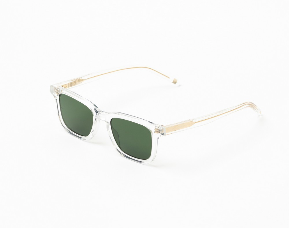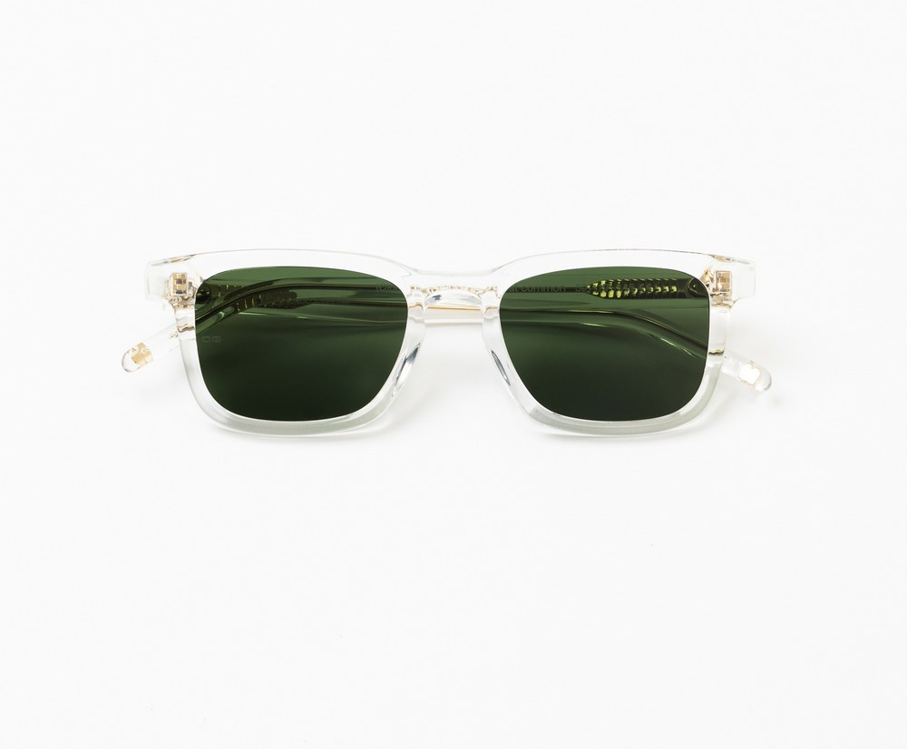 Κοκάλινος unisex διάφανος και γυαλιστερός σκελετός σε σχήμα τετράγωνο και ρετρό στιλ με σκούρους πράσινους UV400 φακούς.