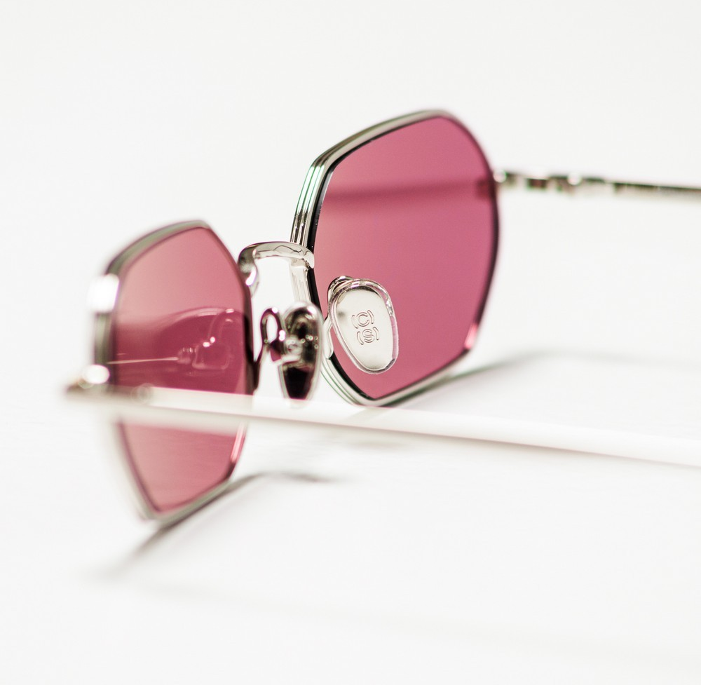 Μεταλλικός unisex ασημί γυαλιστερός σκελετός σε σχήμα φουτουριστικό και πολυγωνικό οβάλ στιλ με σκούρους ροζ UV400 ανοιχτόχρωμους φακούς.