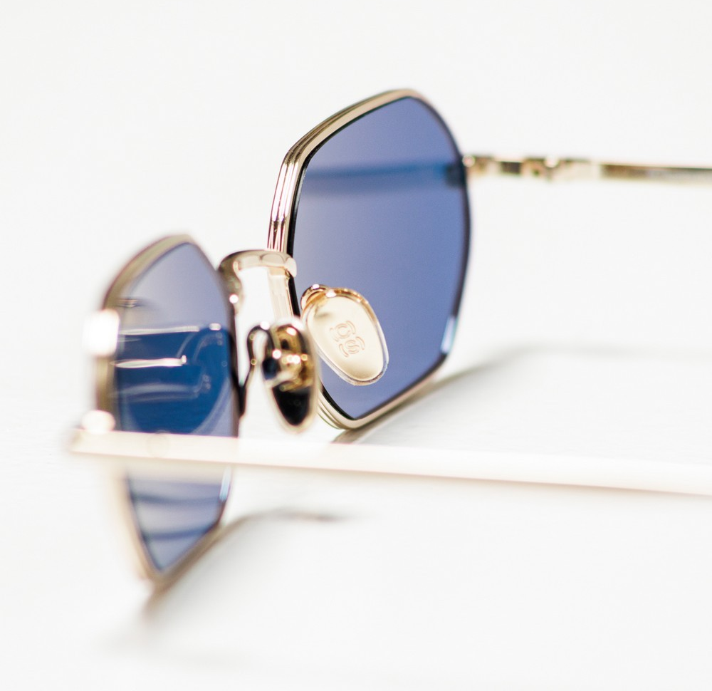 Μεταλλικός unisex χρυσός-ασημί γυαλιστερός σκελετός σε σχήμα φουτουριστικό και πολυγωνικό οβάλ στιλ με σκούρους μπλε UV400 φακούς.