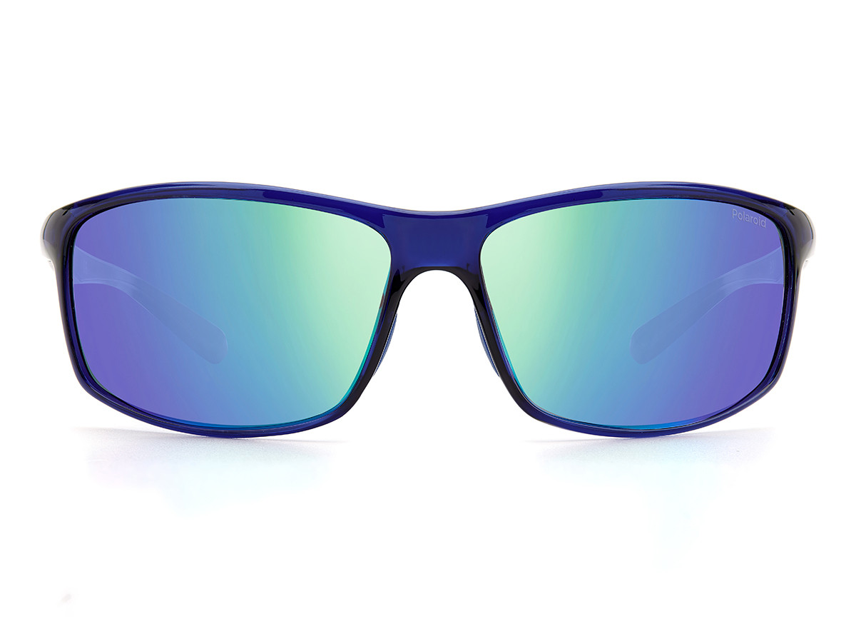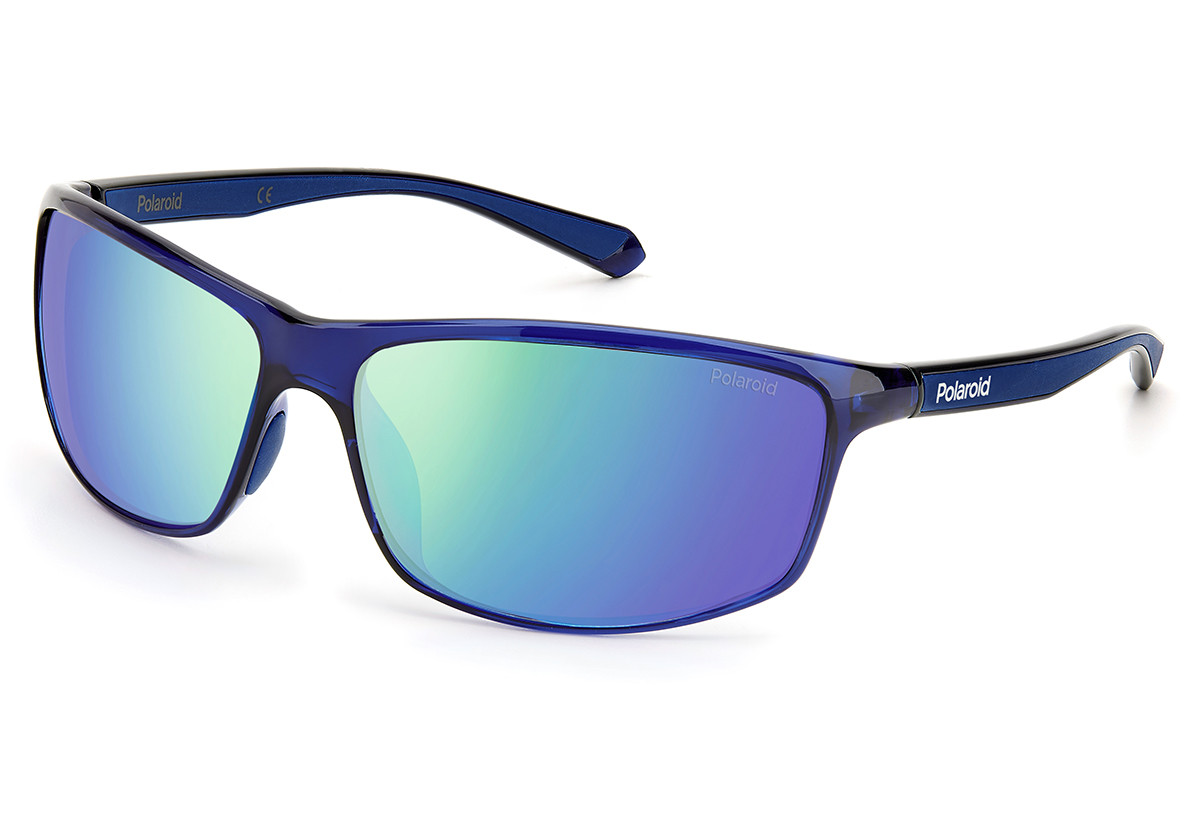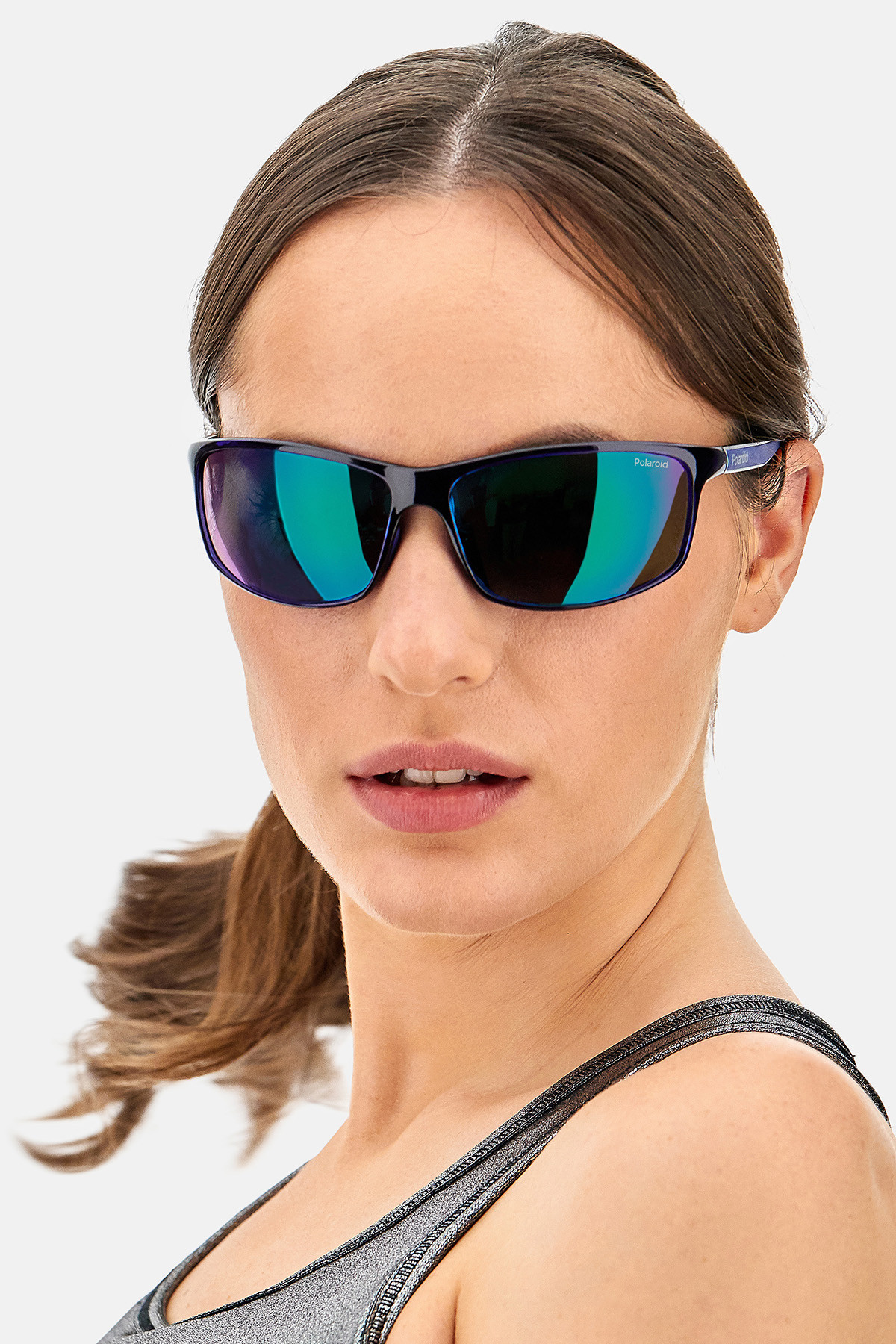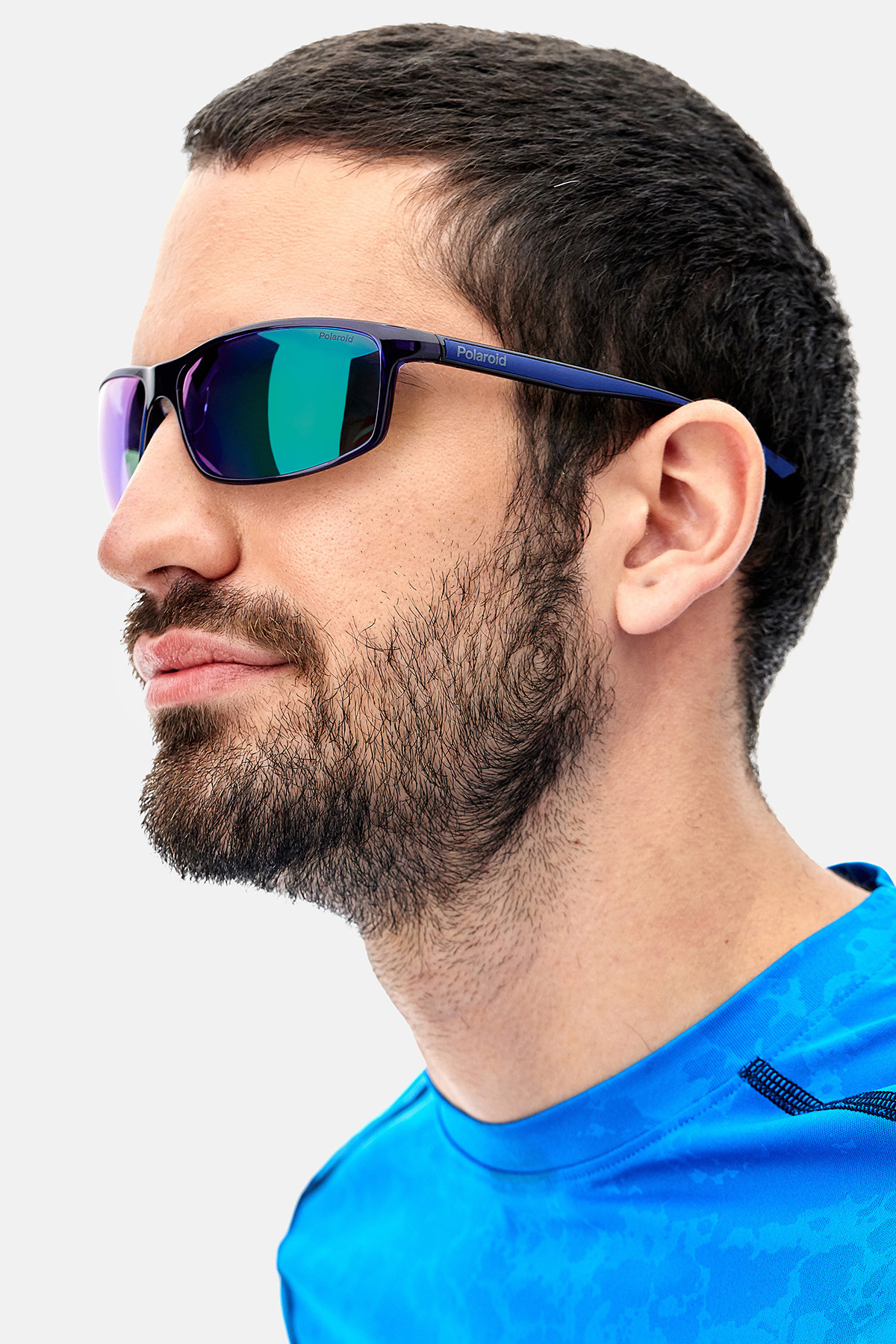 Πλαστικός tr90 unisex σκούρος μπλε γυαλιστερός και ελαφρύς σκελετός σε σχήμα μακρόστενο και αθλητικό στιλ με σκούρους γκρι-μωβ πολωτικούς και μπλε καθρέπτη φακούς.